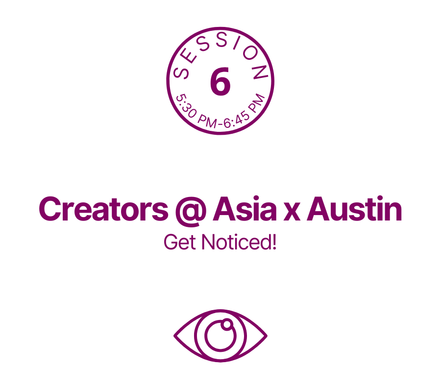 | 5:30 - 6:45 pm [session info] | Creators @ Asia x Austin: Get Noticed! |
