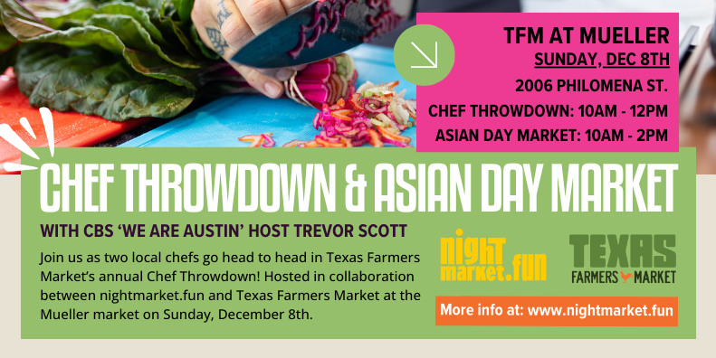 We’re excited to invite you to a FREE, open-to-the-public celebration of culinary arts, community, and culture at our Chef Throwdown and Asian Day Market at Texas Farmers Market at Mueller! Save the date for Sunday, December 8th and get ready to experience a thrilling event packed with flavors, vendors, and entertainment, proudly hosted by Nightmarket.fun and Texas Farmers Market.